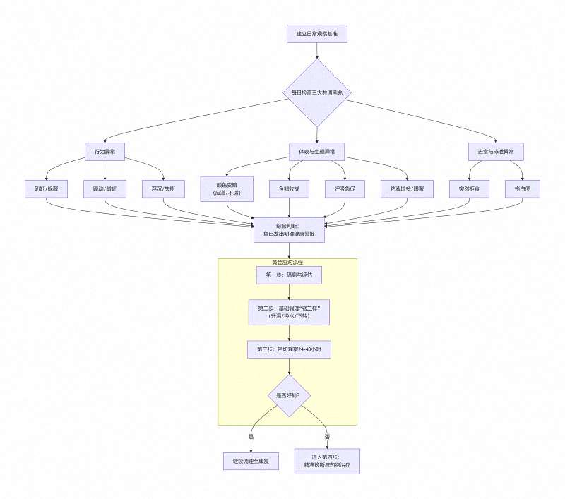 为了让你能清晰地掌握从观察、判断到行动的全过程,下图概括了雷龙鱼生病前兆的核心观察体系与应对路径: